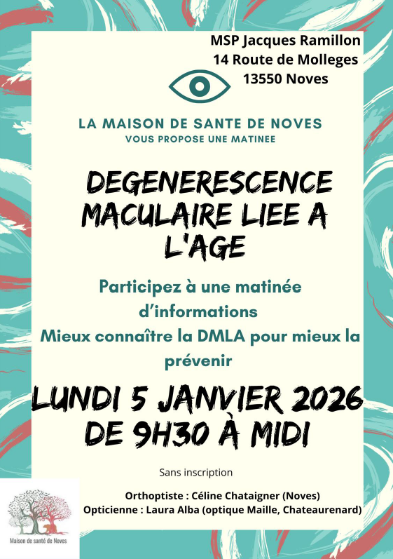 Le 20 septembre 2023 a eu lieu une conférence sur les troubles de l’équilibre et du vertige à la salle des expositions de la mairie de Noves. L’objectif de cette conférence était d’améliorer la prise en charge et le parcours de soins des patients atteints de troubles de l’équilibre et de vertige. Nous avons eu l’honneur de recevoir Dr Gazzano, Dr Chabert, Dominique Querel, kinésithérapeute vestibulaire et Céline Chataigner orthoptiste à Noves.